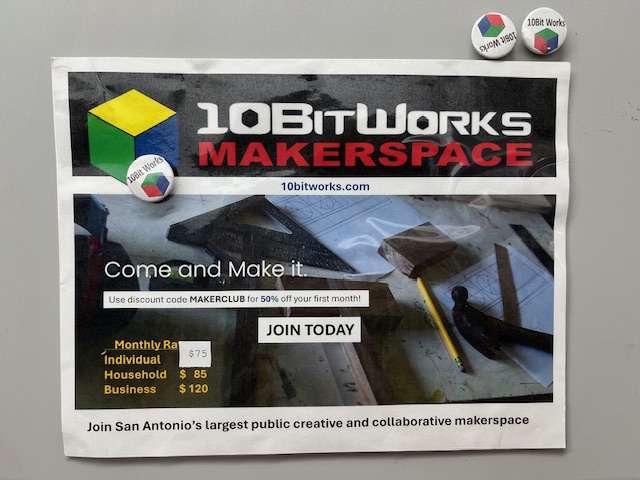 10BitWorks, located at 130 W. LaChappelle just off of South Flores, has open visiting hours from 9 a.m. until 1 p.m. on Saturdays and Sundays. Their phone number is (210) 547-0221. Drop by to check out the space and start planning your creations.